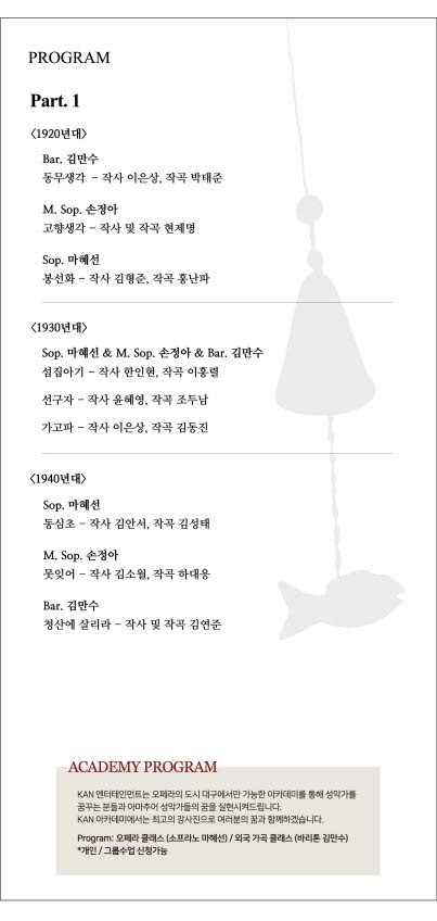 한국 가곡 백년 [풍경소리] 1920년대부터 현대까지 대구 성악가들의 아름다운 목소리로 한국가곡을 만나는 시간 쌀쌀한 가을밤에 여러분을 찾아갑니다.
